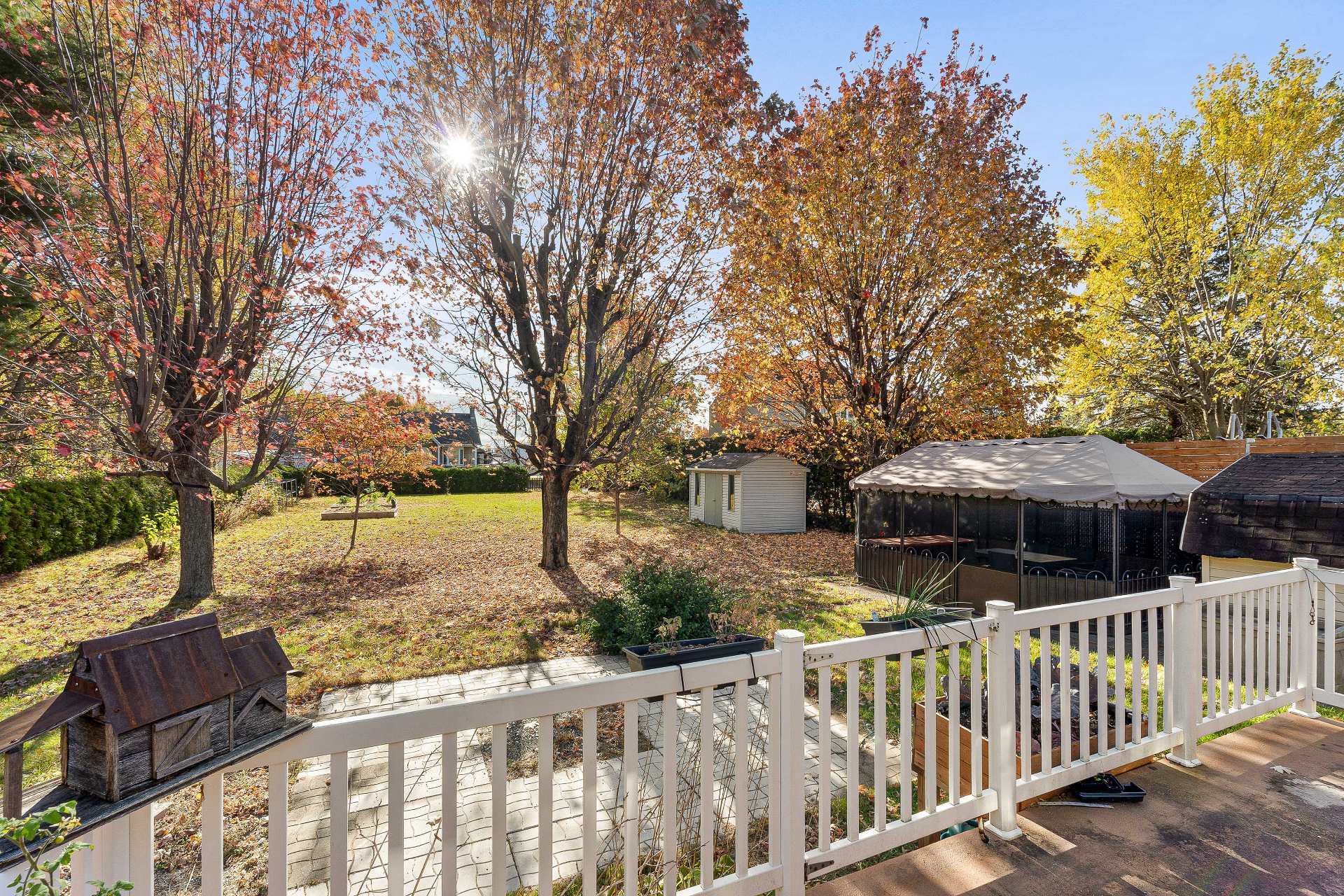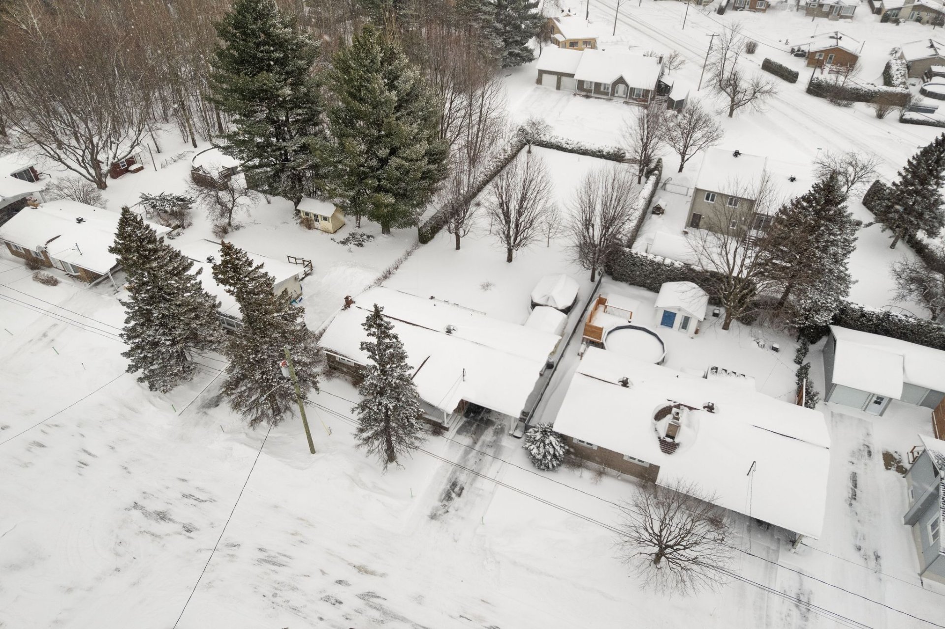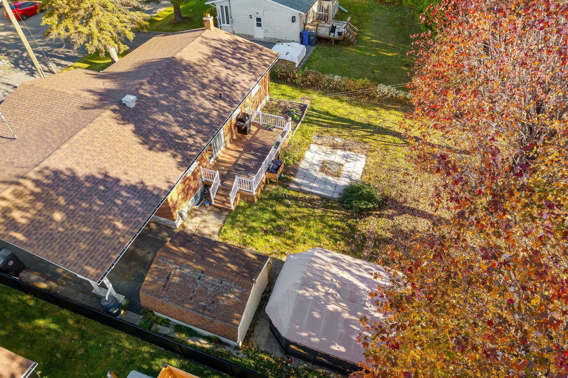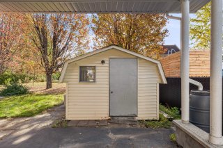 Inclus : Stores, luminaires, pôles et rideaux, hotte micro-onde, meuble marron de rangement au salon, abris de jardin (gazebo), 2 meubles 2 portes noir dans la salle de bain et la salle familiale, balayeuse centrale et ses accessoires, étagères et meubles fixés au mur dans l'atelier