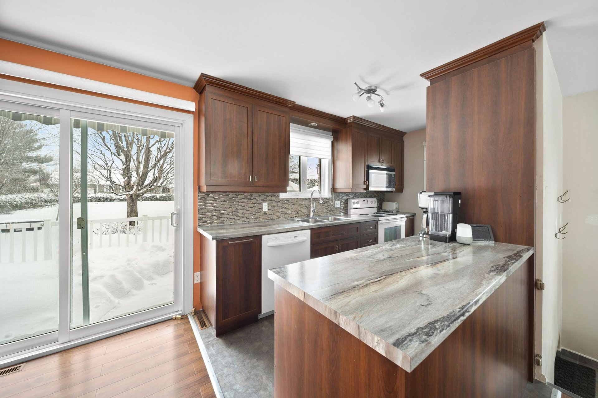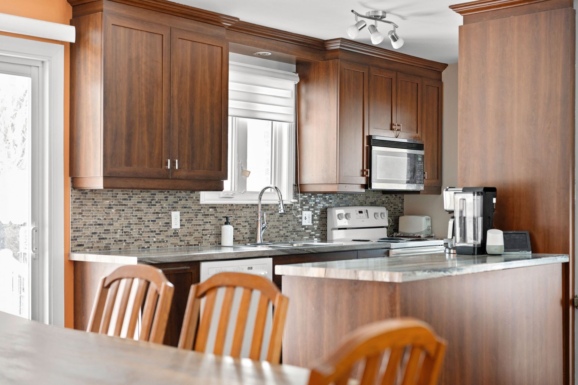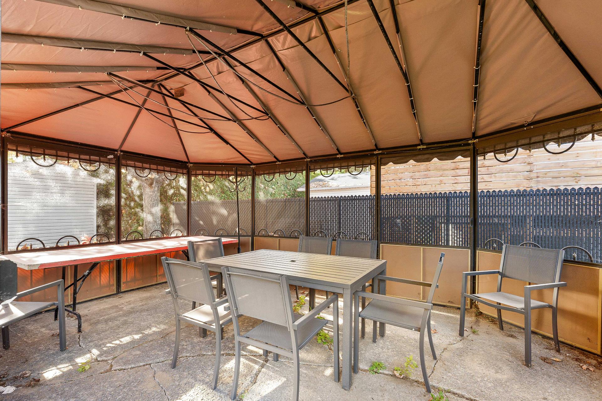 Inclus : Stores, luminaires, pôles et rideaux, hotte micro-onde, meuble marron de rangement au salon, abris de jardin (gazebo), 2 meubles 2 portes noir dans la salle de bain et la salle familiale, balayeuse centrale et ses accessoires, étagères et meubles fixés au mur dans l'atelier