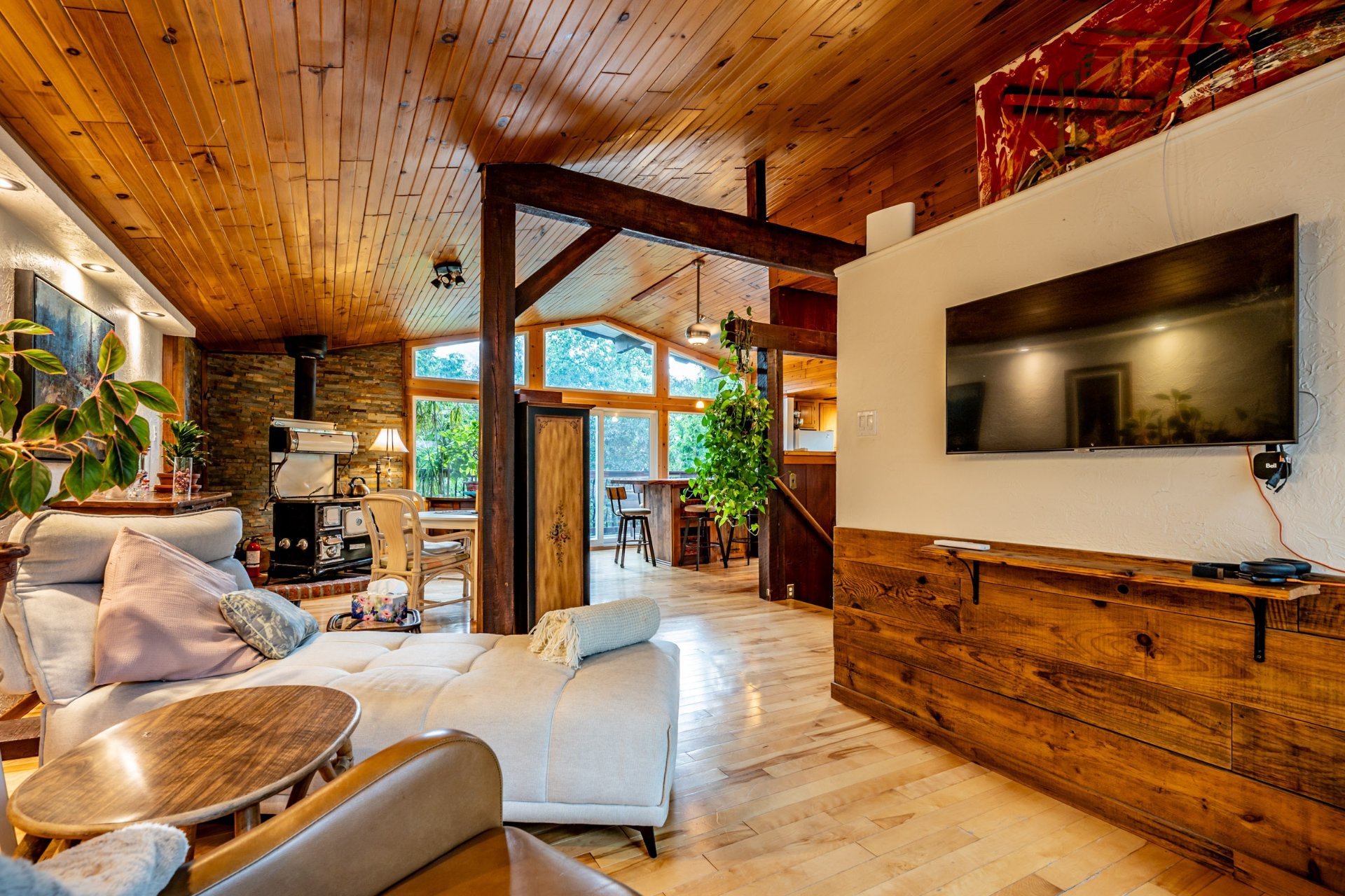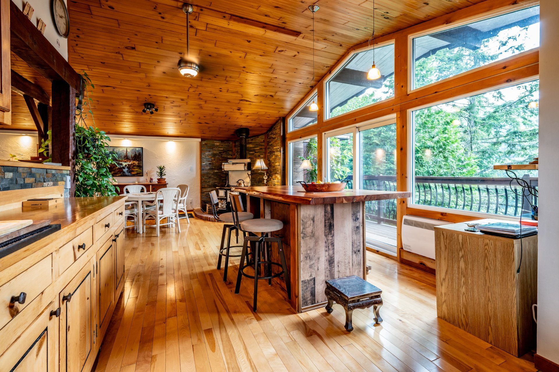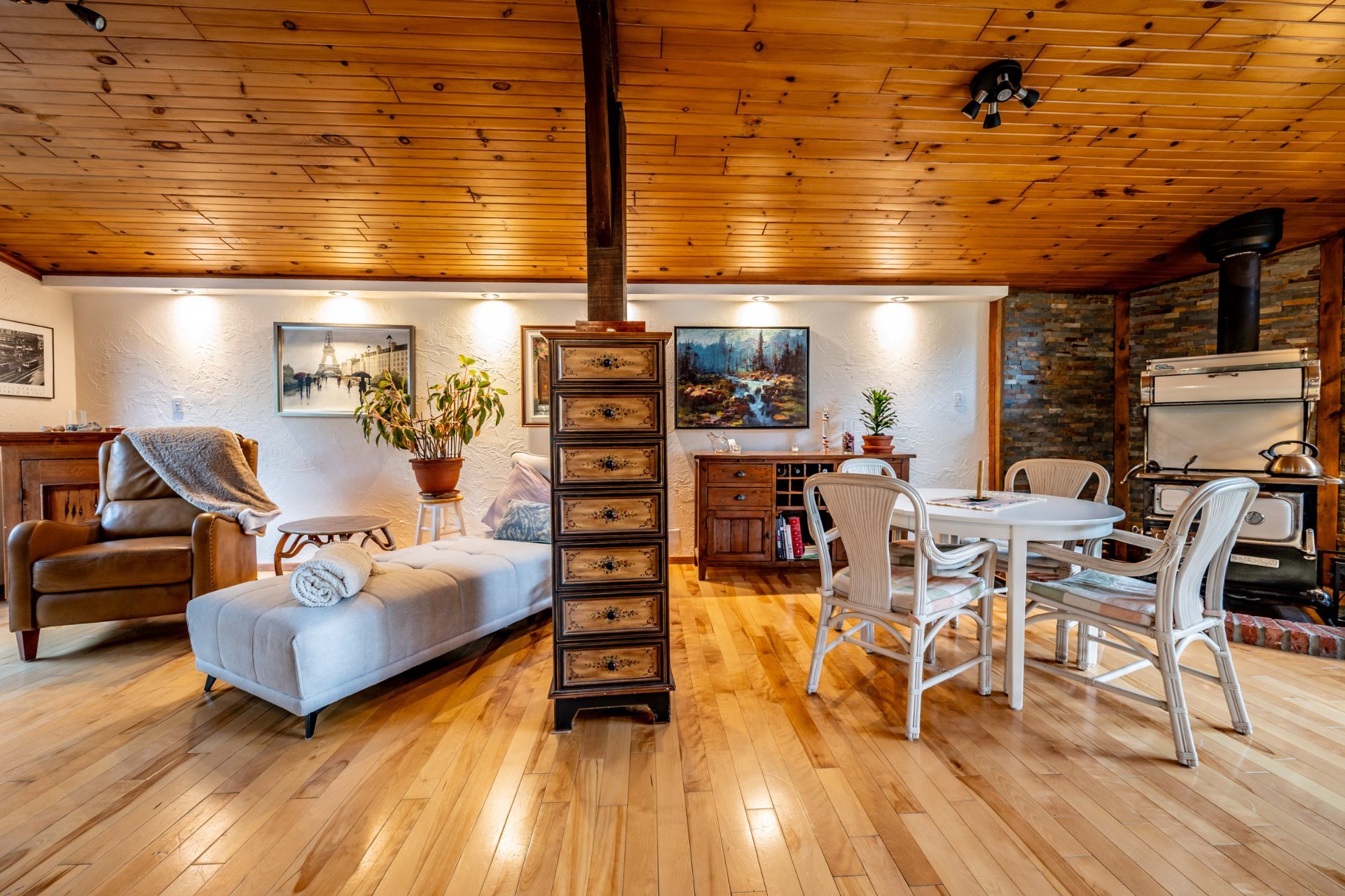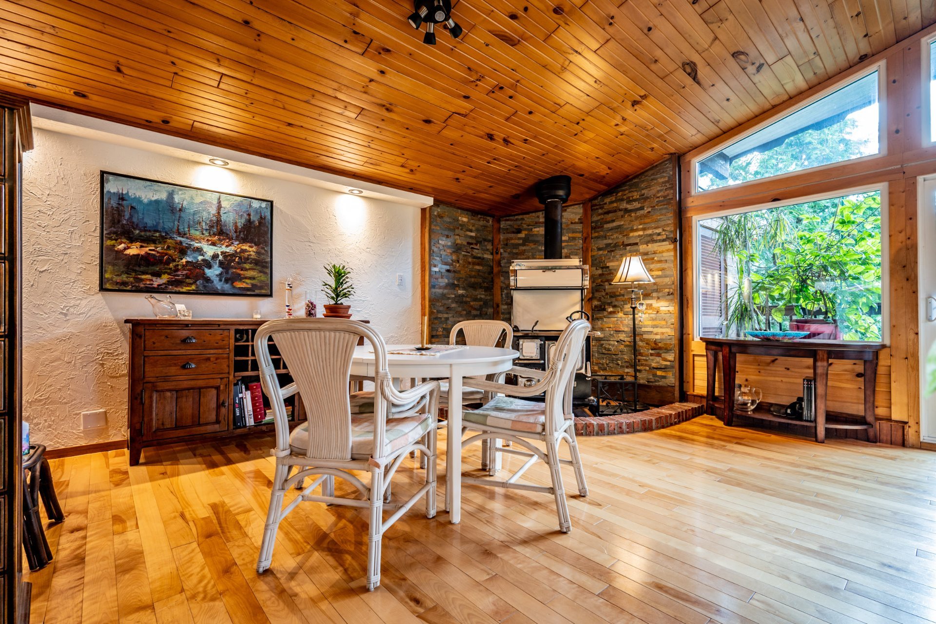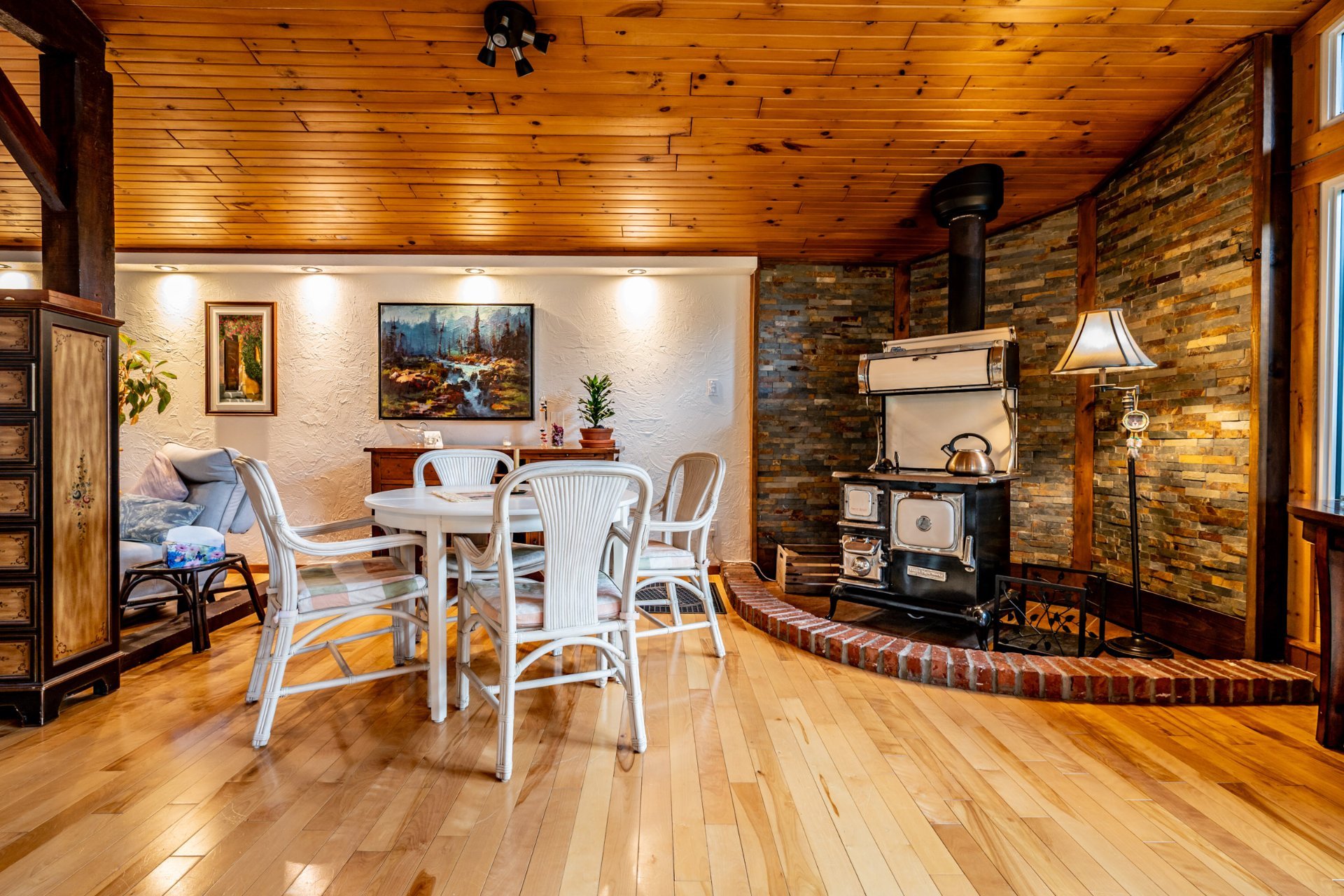 Inclus : Rideaux et stores (sauf dans chambre des maîtres). Cuisinière au gaz propane, cuisinière d'antan au bois, poêle à combustion lente et banc pour bois. Balayeuse centrale, réfrigérateur, lave-vaisselle, hotte, micro-ondes et grand îlot dans salle à dîner avec tabourets. Air climatisé/chauffage. Armoire de cuisine, meuble d'entrée et penderie, ventilateurs de plafond, spa et sauna et leurs mobiliers et foyer au propane. Support télé, bahut-buffet ancien dans salle à manger et meuble 3 portes au RDC